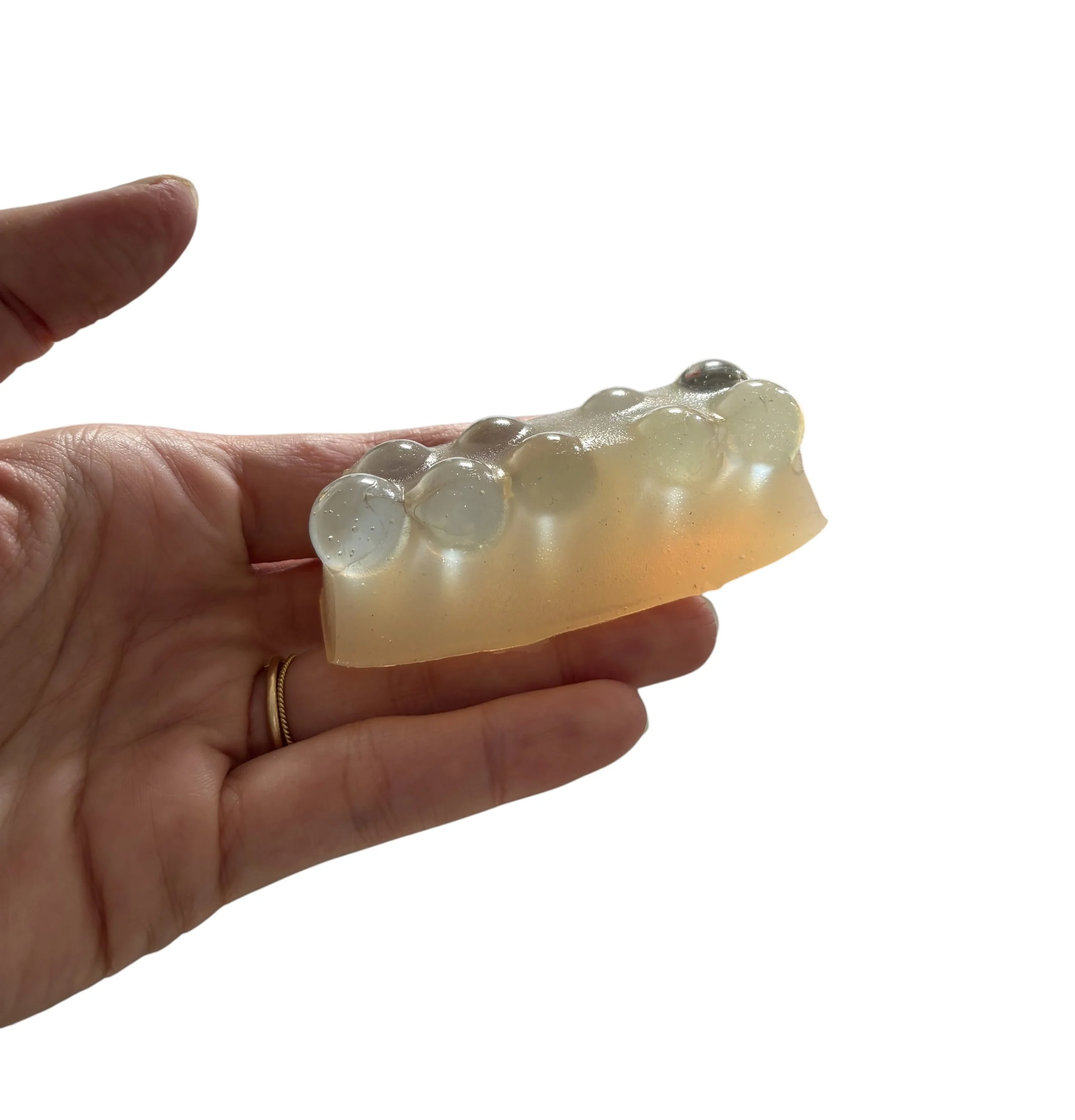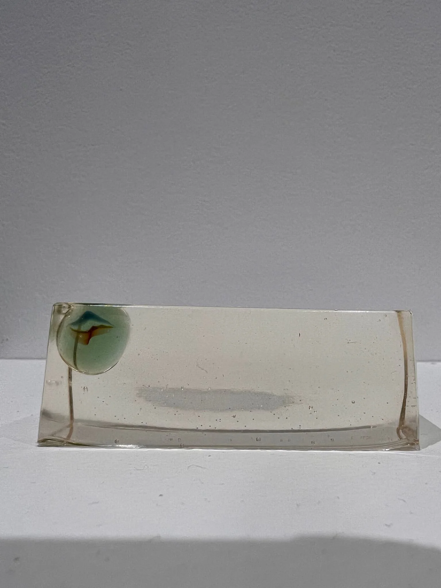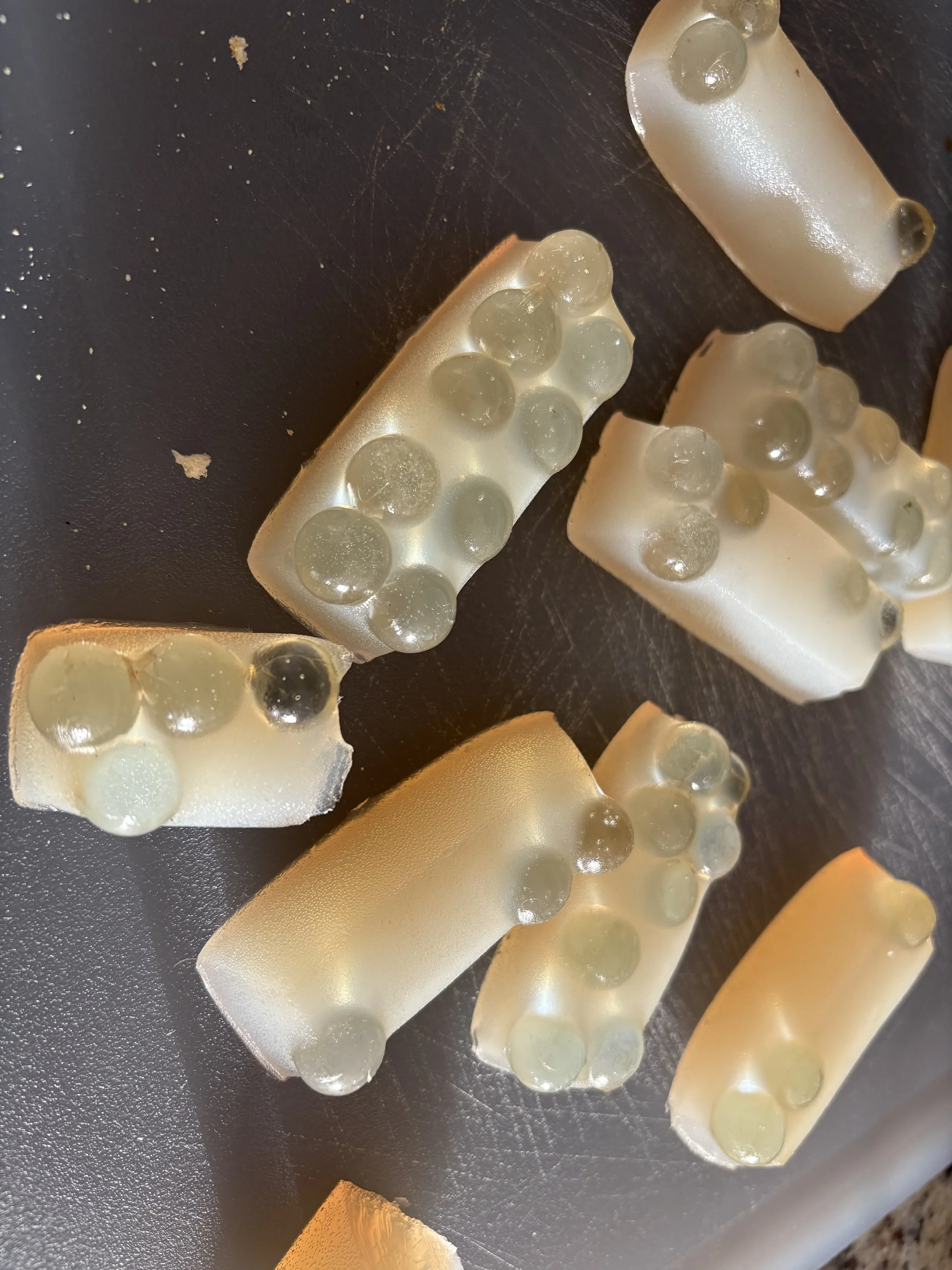 Below is an agar prototype with embedded glass marbles developed as part of the material research for Unchilding. The study explores transparency, light transmission, scale, and the suspension of ordinary objects of play. It documents the project’s development from biodegradable testing phases toward the final bio-epoxy installation.